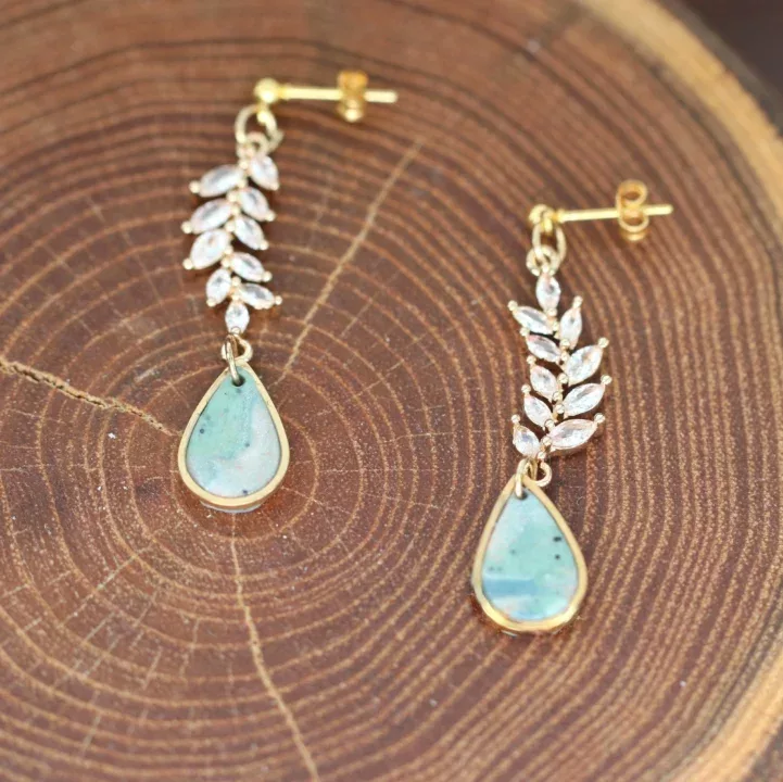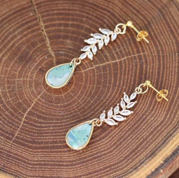 Miniberry prináša novú kolekciu ručne modelovaných šperkov z polymérovej hmoty. Vyber si tieto podmanivé náušnice, ktoré podčiarknu slávnostný outfit v jemných pastelových mentolovo-púdrových tónoch. Náušnice sú modelované z polymérovej hmoty rôznych efektov, zlatých plátkov, ošetrené kryštálovou živicou a doplnené komponentmi z chirurgickej ocele v zlatom odtieni. Medzikus tvorí pôsobivá aplikácia v tvare vetvičky s lístím, v ktorej sú vsadené žiarivé zirkóny.